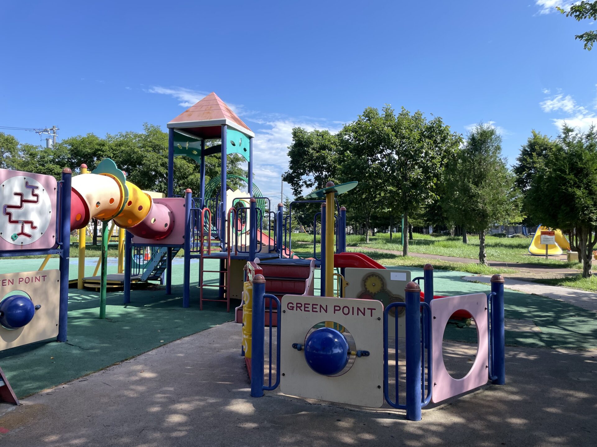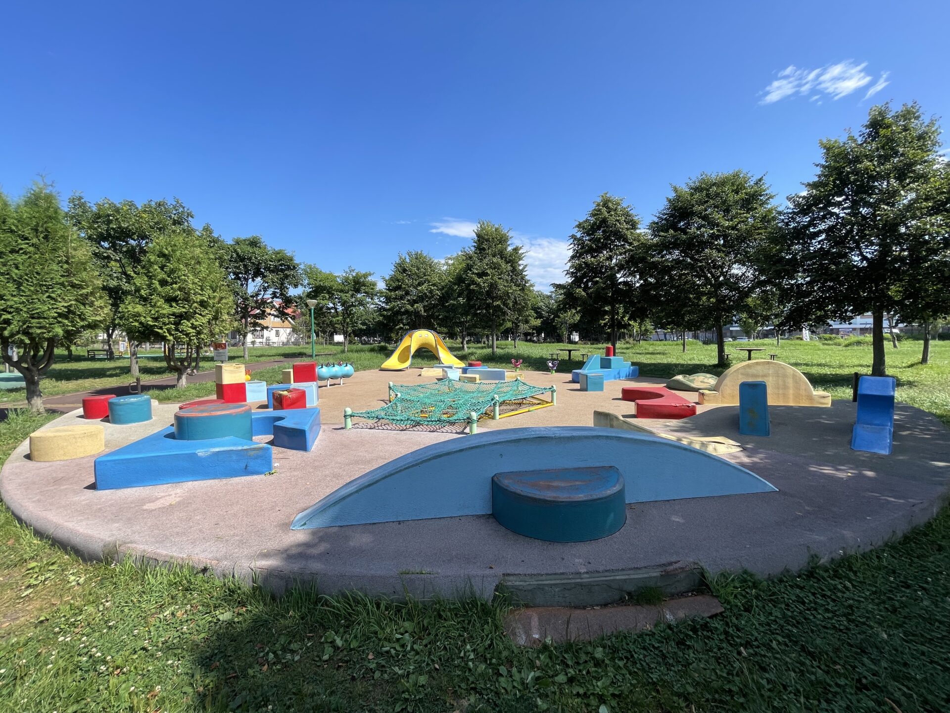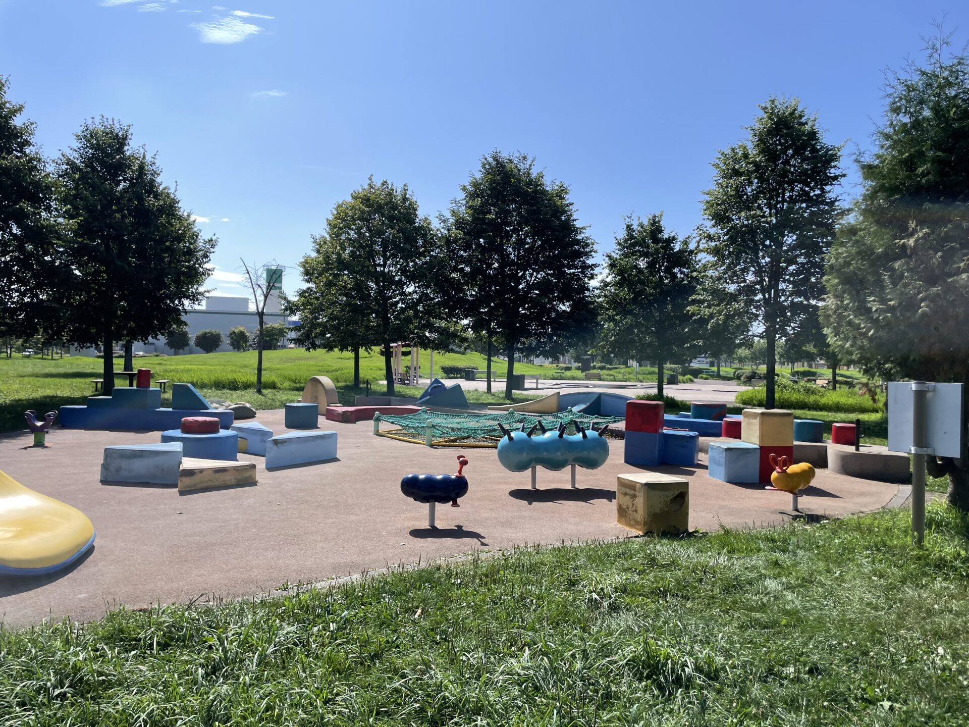 駐車場も広く、メイン遊具やおもちゃ箱広場も、木々に囲まれて木陰があり太陽を程よく遮ってくれて遊びやすく、おもちゃ箱広場は遊具が柔らかく小さな子どもでも遊びやすい印象です。