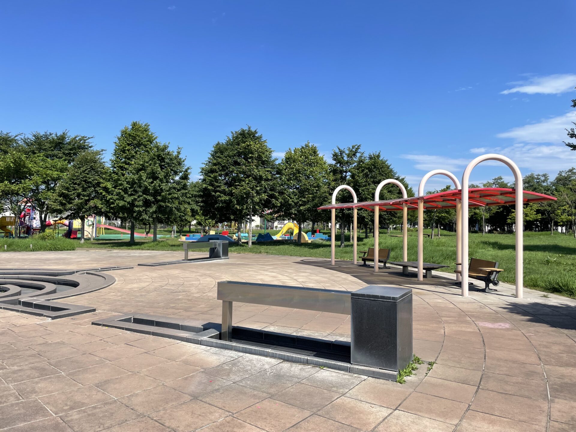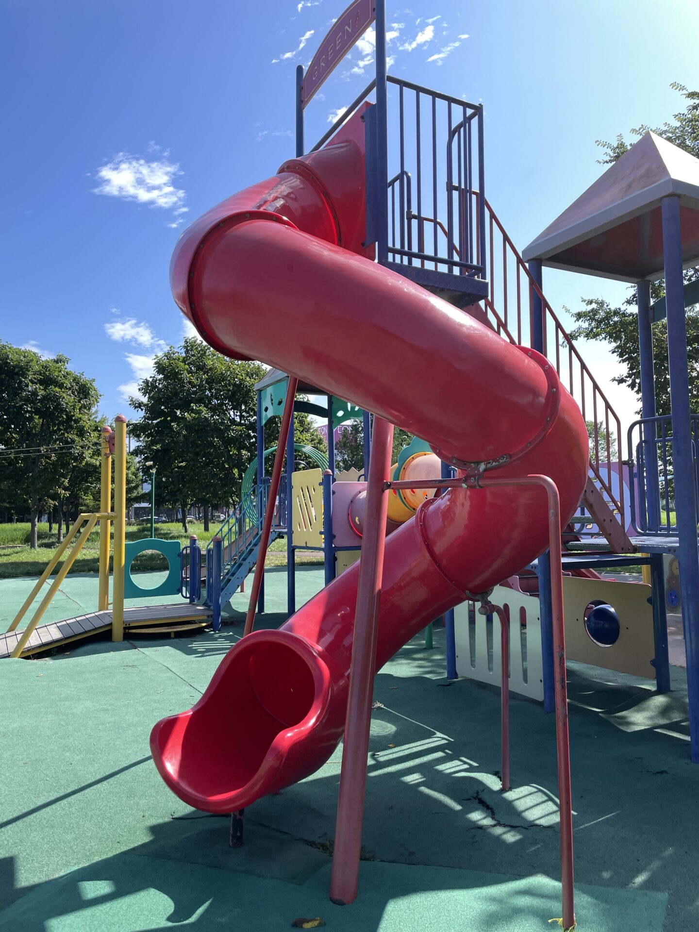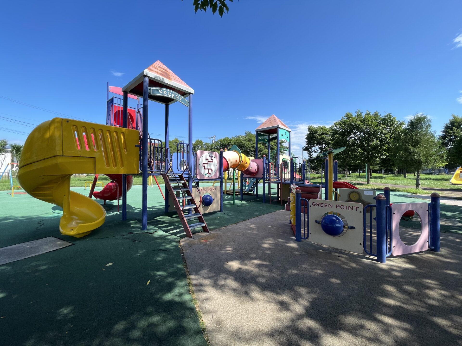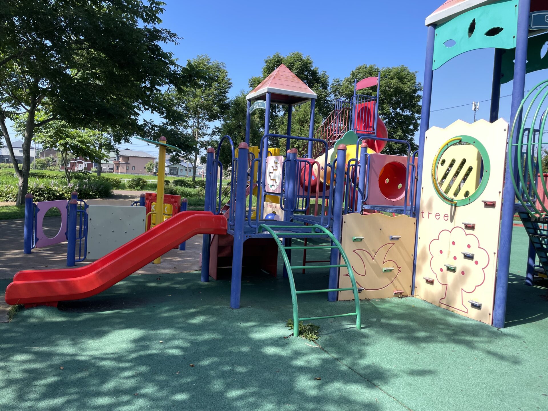 駐車場も広く、メイン遊具やおもちゃ箱広場も、木々に囲まれて木陰があり太陽を程よく遮ってくれて遊びやすく、おもちゃ箱広場は遊具が柔らかく小さな子どもでも遊びやすい印象です。